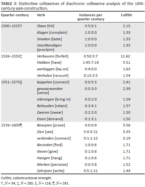 In the table below we present the results of our diachronic collexeme analysis for the four quarter centuries of the 16th-century, calculated with Gries (2007). The verbs showing a significant preference (95% confidence level) for a quarter century are listed per quarter century. Next to each verb the number of times that verb is found in each period is indicated. The second number indicates the collostructional strength.5 The higher the collostructional strength, the more the collexeme occurs in that period or construction. The collostructional strength is calculated by comparing the distributions of every collexeme and construction concerned. Note that it is possible for a collexeme to occur more in period x than in period y, but still show a preference for period y as it occurs more than other verbs in period y. For example, the verb slaan 'hit' is a distinctive collexeme for the first quarter century but was only attested three times in the first quarter century and five times in the second quarter century, 0 times in the third quarter century and finally one time in the fourth quarter century. The collostructional strength of the verb slaan is 2.15. If the collostructional strength is higher than 1.33, the collexeme is significantly distinctive for a certain period or construction. That means that the use of zien 'see' in the aan-construction occurs significantly more often in the fourth period than we would have expected from a random distribution of all attestations over the four quarter centuries. Eventually 22 collexemes prove to be distinctive: four for 1501-1525, four for 1526-1550, six for 1551-1575 and eight for 1576-1600 (Table 3).