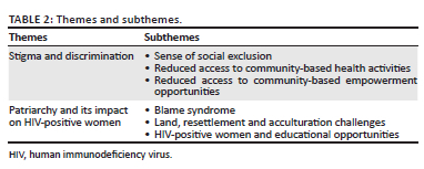 Two themes and related subthemes emerged: stigma and discrimination and patriarchy and its impact on HIV-positive women (as shown in Table 2).