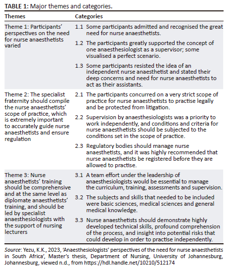 The authors thank all the participants for sharing their most personal and valued experiences. This article is partially based on the author's thesis entitled 'Anaesthesiologists' perspectives of the need for nurse anaesthetists in South Africa' towards the degree of Master of Nursing Science: Medical and Surgical Nursing in the Department of Nursing, University of Johannesburg, South Africa, October 2023, with supervisor, Prof. Charlene Downing, and co-supervisor, Dr. Sidwell Matlala. It is available here: https://hdl.handle.net/10210/512174.