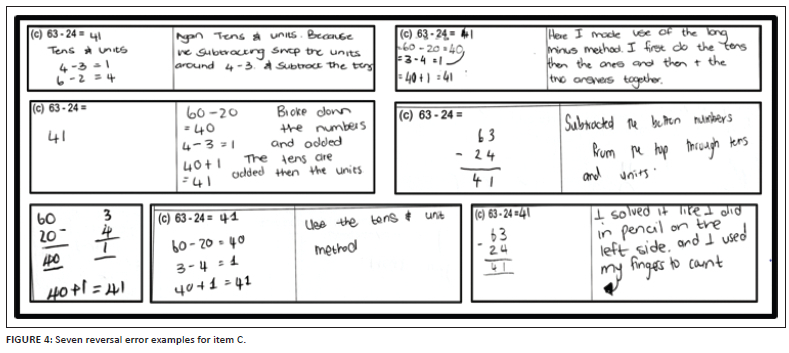 As shown in Table 1, item C (63-24) was the item where PSTs made the most errors. The discussion above about the CAPS-promoted method of breaking up the numbers while avoiding examples of how to use this method for a problem such as this where the unit digit in the subtrahend (4) is greater than the unit digit in the minuend could partly explain the poor performance on this item. Analysis of the 11 incorrect answers revealed that the most prevalent error involved a reversal of the units (in both the breaking down method and with the vertical algorithm). Seven PSTs reversed the units (shifting the problem from 63-24 to 64-23 to avoid the subtraction of a larger number from a smaller number, thus giving the answer as 41. Figure 4 provides all seven instances of the reversal errors, with the PST in the first instance in the image stating this reversal as her method - 'Again Tens & units. Because we are subtracting, swop the units around 4-3 and subtract the tens'. The reversal of numbers is a common error that arises in subtraction where learners reverse digits to avoid subtracting a larger digit number from a smaller digit. This can be an indication that the learners do not comprehend place value or have a good understanding of base 10 and the number line. This lack of place-value knowledge impacts later learning. This has been seen in other countries at various levels of school, including Senior phase students in the beginning stage of learning formal algebra (e.g. MacGregor & Stacey 1993).