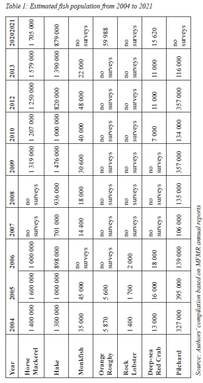 The table indicates no consistency in the survey of fish species populations in Namibia. From the available data shown in Table 1, fish species' populations have fluctuated over the years. For instance, the hake species population was 1.39 million in 2013 but decreased to less than a million (879 000) or by 37 per cent in 2021. In 2012, the monk fish population was 48 000 but decreased to 22 000 or by 54 per cent in 2013. In 2012, the pilchard population was 357 000 but decreased to 116 000 or by 68 per cent in 2013. Fluctuations in fish species can be attributed to commercial fishing, illegal fishing, and inconsistency in surveys.