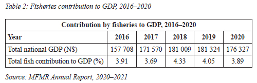 Thirdly, maritime security as an integral component of the national security of Namibia relates to economic growth and development. The persistent problem of illegal fishing activities may hinder economic growth and development if adequate measures are not in place. Currently, the contribution of the fisheries sector to the Namibian gross domestic product (GDP) has remained relatively stable at 4,0 per cent over the years as shown in Table 2.