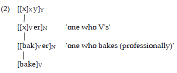 Hierarchical constructional schemas represent generalisations about existing complex words while simultaneously providing a structured framework for the formation of new words (Booij 2010). The relationship between an abstract constructional schema and its individual instantiations can be represented in a tree structure, where the schema functions as the dominant node, and individual lexical items occupy lower-level nodes that inherit the properties of their super-ordinate categories. For instance, the derivative baker can be represented within such a hierarchical structure (Booij 2005: 124), as shown in schema (2):