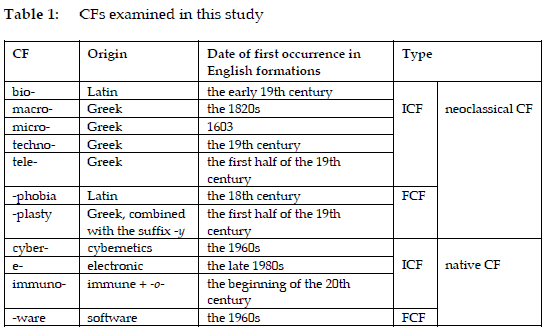 As allomorphic variants of classical Latin or Greek words, the five ICFs bio-, macro-, micro-, techno-, and tele- that end with a vowel /o/ or /i/ are neoclassical CFs. Two other neoclassical CFs -phobia and -plasty are FCFs. This paper also examines four native ICFs, including cyber-, e-, immuno-, and -ware, of which immuno- derives from 'immune' and -o- while the other four are truncated from existing English words. Cyber-, e-, and -ware are new CFs whereas the other eight CFs have been in use longer. The 11 CFs were selected because they provide a representative sample including both traditional and emerging CFs, diverse origins, structural roles (ICFs and FCFs), and distinct historical stages of development. All of the said CFs have been productive in making new words to varying degrees in the past decades. These CFs are well-suited for analysis, as they have formed a sufficient number of new compounds for investigation. The time span from the 1960s to the 2020s was chosen because sufficient time has passed to enable a measurement of productivity of the 11 CFs in forming new compounds.