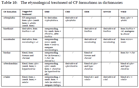 The existing deficiencies are as follows: Firstly, the etymological information, especially the ways of formation provided for the same CF formation, may vary in the said dictionaries. Secondly, the etymological information offered for some CF formations is not sufficiently clear and accurate. For instance, bioethicist is a derivative. However, its way of formation is treated differently in the five above-mentioned dictionaries. Bioethicist is a compound according to the OED, whereas it is indicated as being derived from bioethics in ODE, MWCD, and WKD. As is attested in the OED, bioethics first appeared in 1970, while the date of first appearance of bioethicist is 1973. It can be reasonably asserted that bioethicist is a derivative rather than a compound. Table 10 displays the lexicographical treatment of cyberphobic (compound), biochar (blend) and other words as well.