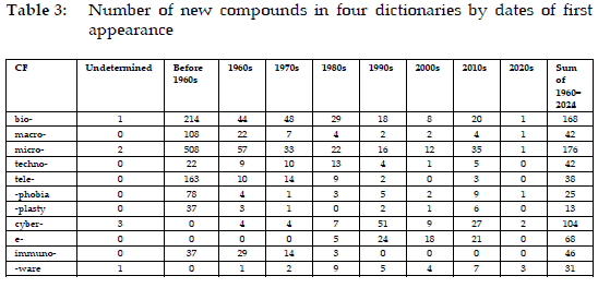 The new compounds formed with each CF and recorded in the OED, DCEN, ECDN, and CECDN were compiled together, with duplicates excluded. The dates of first use for these compounds are sourced from dictionaries such as the OED, ODE, CED, MWCD, and corpora like COHA, COCA, and NOW. Most of the CFs in question were used to form compounds before 1960 or have formed such words since the 1960s (except e-). This paper uses 1960 as the starting year to measure the productivity of the CFs in producing new compounds while the ending year is 2024. Compounds formed between 1960 and 2024 and recorded in the aforementioned four dictionaries are enumerated in Table 3. The '2020s' are used to refer to the period from 2000 to 2024, for consistency with others. With the data-driven periodisation in place, the analysis of these compounds are divided into ten-year intervals. Note that the absence of new CF compounds in certain periods in the four dictionaries does not imply that these CFs did not form any compounds during these periods. Instead, it indicates that the compounds they formed did not become established to warrant lexicographic inclusion.