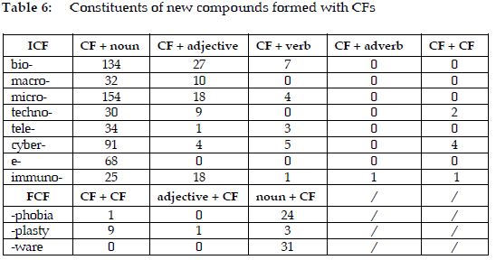Table 6 illustrates the compounding of CFs with other constituents, with the "CF + noun" construction dominating across all ICFs. Bio- forms 134 noun compounds, while micro- and cyber- contribute 154 and 91, respectively. Though "CF + adjective" and "CF + verb" constructions appear, they are less frequent, and the "CF + adverb" construction occurs only once in immunoelectrophoretically. Some ICFs, such as techno-, cyber-, and immuno-, also form "CF + CF" constructions. As for the FCFs, -phobia mainly forms "noun + CF" constructions and the only -phobia compound in the form of "CF + CF" is coronophobia. The dominant construction of -plasty is "CF + CF". Compounds formed with -ware exclusively use the "noun + CF" construction.