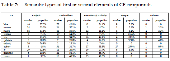 Bio- primarily combines words expressing abstractions (bioavailability), or those denoting objects (biochip), and behaviours and activities (biohacking). Only a few bio- compounds involve people (biohacker), and none refers to animals. Macroand micro- display clear semantic preferences for abstractions (macromodelling) and objects (macrolens). Micro- also combines the second elements referring to behaviours and activities (microblogging). Techno- strongly favors the combination with the second elements representing abstractions (technocentrism). Tele-mainly combines with the second elements representing behaviours and activities (telebroking). Cyber- primarily combines the second elements that belong to behaviours and activities (cyberauction), and abstractions (cybercommunity). Further data on other CFs can be found in Table 7.