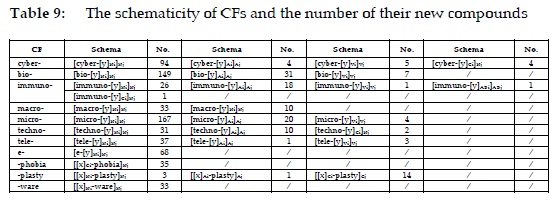 Table 9 presents the constructional schemas of the other 10 CFs, and their schemas have varying degrees of productivity in the formation of new compounds. The CF compounds show syntactic constraints, since the first or the second elements which the CFs can combine are of different word classes. It can be noticed that bio-, micro-, and tele- all have three schemas. They can combine a noun, an adjective, or a verb to form new compounds. CFs such as techno- and -plasty also exhibit three schemas. Apart from compounding with a noun or an adjective, they can form compounds with CFs. Macro- can be abstracted into two schemas and this CF can form compounds with a noun or an adjective. These constraints reflect the interplay between form and meaning in CxM, where some CFs serve highly specialised functions while others exhibit broader productivity across multiple schemas.