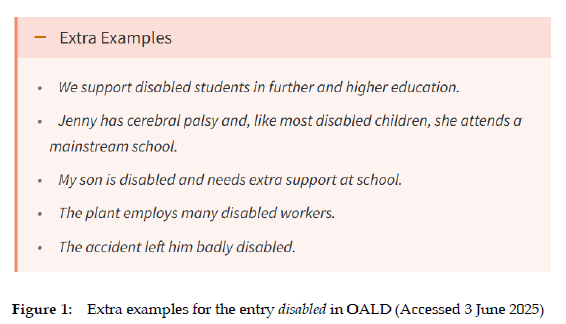 This study offers a preliminary exploration of the exemplification of sensitive medical words in dictionaries. There are numerous avenues for further research. A survey of users' interpretations of the examples provided for sensitive words in dictionaries would be particularly valuable. Such studies would enable lexicographers to better understand how different users, particularly users with disabilities, interpret and evaluate the lexicographic treatment of sensitive medical words. Besides user research, an investigation into the representation of people with disabilities through sentence examples could also be pursued in future studies. There is also a need for research that could have a greater concern for the rights and experiences of disabled people in lexicography. Such research would contribute to our understanding of disability in lexicographic discourse and promote inclusive language.