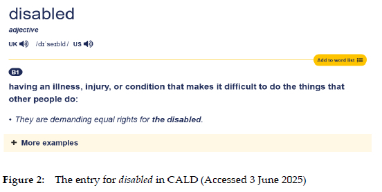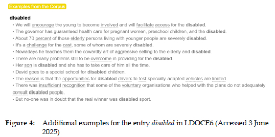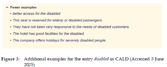 CALD allows users to choose a display of More examples or Fewer examples following the examples provided within the core entry. An example is the entry for disabled shown in Figure 2. There is only one example nested within the core entry. However, if users want to see more examples, they can click on the More examples link, and more examples for the word will be displayed (see Figure 3). Although CALD does not provide any information on the site about the selection of illustrative examples, Wendalyn Nichols, Publishing Manager of the Cambridge Dictionary, confirms that the examples within the core entry in CALD are all chosen by lexicographers in the process of compiling the entries according to the usual principles for learner's dictionaries. The "more examples" are also chosen by lexicographers from the Cambridge International Corpus using Sketch Engine (personal communication, March 28, 2025).