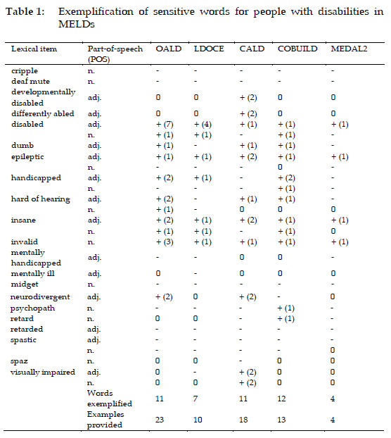 While the importance of examples in dictionaries has been emphasised by many lexicographers (e.g. Zgusta 1971: 263-268; Landau 2001: 305-308; Atkins and Rundell 2008: 452-462), sensitive terms for people with disabilities, particularly those considered offensive (e.g. cripple, deaf mute, midget, retarded, and spastic), appear to be exemplified less frequently in learner's dictionaries. The exemplification of the selected words in the "Big Five" reveals an overall lack of examples and unevenness in the coverage of examples.