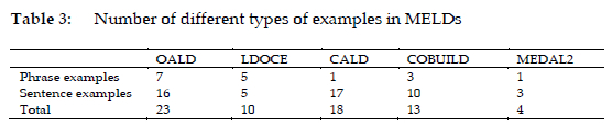A notable phenomenon of exemplification in online learner's dictionaries is the inclusion of additional examples within the extra sections of the entry. Among the four online learner's dictionaries, three (OALD, CALD, and LDOCE) provide a section of additional examples. Generally, these dictionaries do not provide information on their websites about how examples are selected. It is therefore unclear to users whether these additional examples are automatically generated from corpora or chosen by lexicographers.