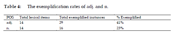To quantify this exemplification trend, a comparative analysis was conducted (see Table 4). Across the dataset presented in Table 1, there are 14 adjectival terms and 14 nominal terms. The adjectival terms receive a total of 29 instances of exemplification (out of a possible 70), resulting in an average exemplification rate of 41%. In contrast, the nominal terms receive only 16 instances of exemplification (23%). This substantial difference suggests a consistent pattern favouring adjectives in the provision of usage examples.