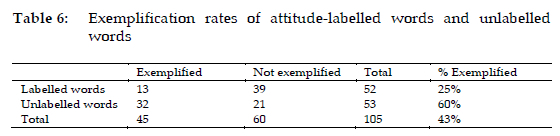 Notwithstanding these differences, the "Big Five" tend to adopt a cautious and selective exemplification of attitude-labelled words. To illustrate this, I tabulated the exemplification rates of attitude-labelled words and unlabelled words in Table 6.