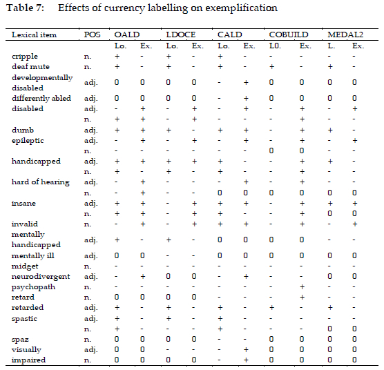 In order to investigate the effects of attitude labelling on the exemplification of sensitive words for people with disabilities in the "Big Five", I examined the exemplification of the words labelled as having negative connotations by means of usage labels (e.g. "disapproval", "disapproving", "impolite", "not polite", "offensive", "rude", and "taboo") and other devices like definitions and usage notes. The results are tabulated in Table 5. In the Table, "L." means labelling, whereas "Ex" indicates exemplification. In the "L." column, a plus sign means that the word's offensiveness is marked by an attitude label in the dictionary. A minus sign shows that no label is provided for the word. A minus sign placed within brackets indicates that the word's offensiveness is marked by other devices such as definitions or usage notes. A zero means that the word or the relevant disability sense is not included in the dictionary.