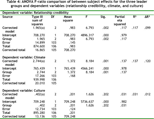 Anovas were then done to assess the relationship between the three leadership groups and the constructs of relationship credibility, climate, and culture. The results are reported in Table 4.