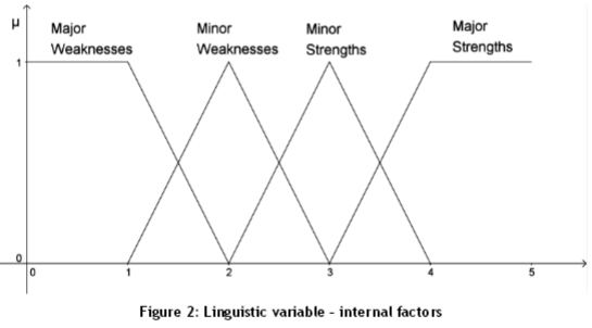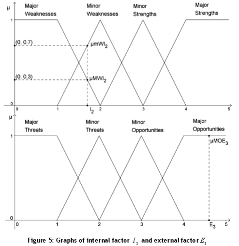 The linguistic variables described earlier in this paper were used to obtain the degree to which the internal and external factors belonged to the given fuzzy sets. The data can be seen in Tables 4 and 5.
