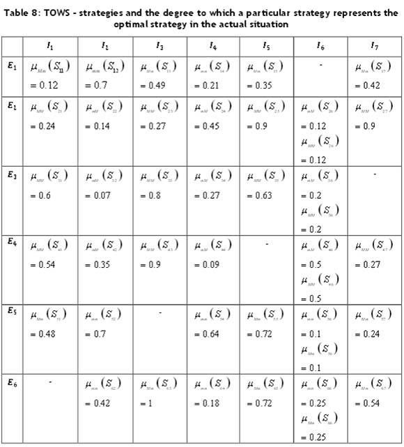 The results obtained are inserted into the matrix. In that way, the fuzzy TOWS matrix includes strategies and the degree to which a particular strategy is the optimal strategy in the actual situation. In order to decide which of the strategies should be retained as optimal solutions, an α- level of the fuzzy set is used. By introducing an α- level of the fuzzy set into the fuzzy TOWS matrix, the best strategies are easily marked off and segregated.