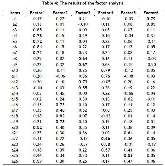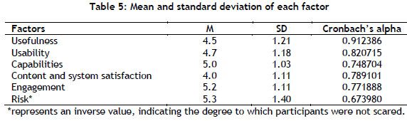 Although the factor loading of a17 was similar, it was assigned to factor 2 owing to its similarity to other variables. The ambiguous item a14 was removed from the analysis. The six factors identified were categorised and labelled as usefulness, usability, capabilities, content and system satisfaction, engagement, and risk.