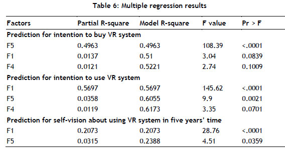 To determine which of the six factors strongly influenced various dependent variables, multiple regression analyses were performed using SAS 9.4 (Table 6). The data we used were the average scores for each factor, since each factor had several items. The three dependent variables we selected were intention of buying a VR system, intention of use with VR system, and self-vision about using VR system in five years' time.