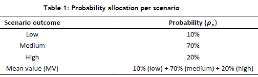 The set of scenarios is S = [low. medium, high}, and associated with each scenario s e 5 is a probability Ps. The mean value scenario is expressed as S = [MV}, and is also associated with a probability . The probabilities are assumed and calculated for each scenario outcome, as shown in Table 1.