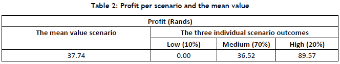 Table 2 summarises the profits in each case: R0.00 (low - 10%), R36.52 (medium - 70%), R89.57 (high - 20%), and R37.74 (mean value). Although the high scenario yields the highest profit of R89.57, it is expected to occur with a probability of only 20%. Planning based on this scenario would be risky. In contrast, the medium scenario results in a profit of R36.52 with a probability of 70%, which is a more reasonably safe scenario to assume, even if the profit is less than that for the high scenario. The low scenario results in no profit, as the ROI threshold is not met owing to low probability values. The mean value scenario provides a more balanced outcome, but still fails to account for the full range of possible scenarios.