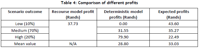 Table 3 shows that deterministic model profits vary widely, depending on the assumed scenario (low, medium, high, or mean value), ranging from R0.00 to R79.90. However, each of these values is based on a single assumed outcome, as explained in Section 4.1. The recourse model provides only a single profit, as it simultaneously investigates decisions for all three possible outcomes.