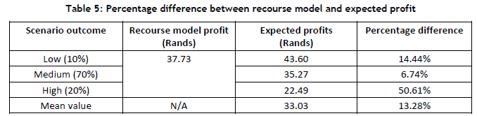 To illustrate how uncertainty influences profitability, percentage differences were calculated between the profits generated by each model and the expected profits obtained from the recourse model. These results are summarised in Table 5.