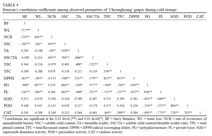 Maintaining the quality of grapes is crucial for the grape industry in Korea, where grapes are grown primarily for fresh consumption (Kim et al., 2021). Consistent fruit quality from harvest to distribution is essential to meet consumer demands. Even after grape harvest, various metabolic processes continue, and water loss due to transpiration can cause the shrivelling and dropping of berries (Lufu et al., 2020). In addition, active oxygen generated during cold storage can lead to cell damage, resulting in the deterioration of grape quality during such storage (Vazquez-Hernandez et al., 2020). 'Cheonghyang' grapes are relatively susceptible to water loss during storage, which contributes to their low storability.
