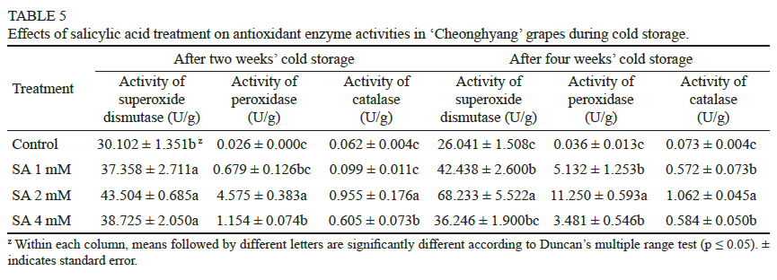 The quality of 'Cheonghyang' grapes was found to be affected differently depending on the concentration of SA used during cold storage. The SA treatment groups demonstrated the ability to maintain grape quality and efficiently regulate the activation pattern of key enzymes associated with cold storage. These results suggest that SA can be an effective method for maintaining the quality of 'Cheonghyang' grapes after harvest. Selecting the appropriate concentration of SA is crucial for extending the shelf life of grapes. If the concentration is too low, it may not enhance antioxidant enzyme activity or stimulate cell defence-related enzymes (Champa et al., 2015). On the other hand, if the concentration is too high, it can damage tissue, reduce cell viability, and induce oxidative stress (Hazarika & Marak, 2022).