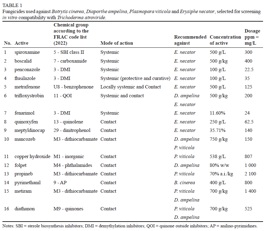 Therefore, the objectives of the current study were to i) evaluate Trichoderma atroviride against the trunk pathogens P. chlamydospora and D. ampelina on sucker wounds in the field and ii) determine the sensitivity of two T. atroviride isolates in vitro against 16 fungicides that are used to control powdery mildew, downy mildew, botrytis rot and Phomopsis cane and leaf spot.