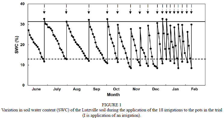 The two water sources used for this experiment were MW, which served as the control, and undiluted WW. The MW used for the control treatments was obtained from the tap at the lysimeter facility at ARC Infruitec-Nietvoorbij. The undiluted WW was collected from a winery near Stellenbosch and was stored in a 2 500 L plastic tank adjacent to the lysimeter facility. Samples of both water sources were collected for each irrigation event and analysed for N, P, K, Ca, Mg, Na, SO42-, HCO3-, Cl-, F-, Mn, Zn, Fe, Cu, B, pH, EC and COD by a commercial laboratory. The composition of each water source varied widely (Table 2), and the pH of undiluted WW was consistently alkaline. Although both water sources differed in their composition, they both had low concentrations of heavy metals, indicating low pollution risk.