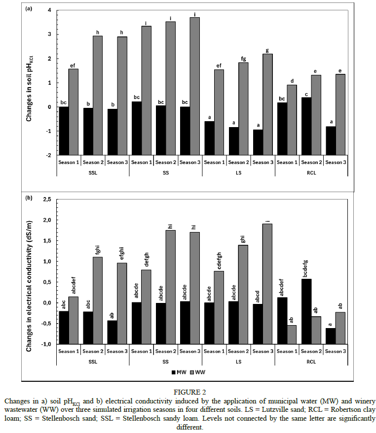 Changes in soil pH(KCl) induced by the application of WW were large, ranging between 0.63 and 3.95, compared to -1.03 and 0.44 induced by MW (Fig. 2a). Changes in soil pH induced by the application of MW were not different among the seasons for all soils. However, changes in soil pH induced by the application of WW increased from season 1 to season 2, and then plateaued for all soils except SS. The changes in soil pH induced by the different water sources and in different seasons reflect the accumulation of bicarbonates, which are known to increase soil pH (Laurenson et al., 2012; Mulidzi et al., 2015; Howell & Myburgh, 2018; Howell et al., 2018). Undiluted WW had higher bicarbonates compared to MW, and increased with increasing seasons (Table 4). In terms of soils, changes in soil pH induced by the application of MW were not different between the soils, except for LS, which had lower changes in soil pH. In contrast, changes in soil pH induced by the application of WW were higher in SS, followed by SSL and LS, and then lower in RCL. This is probably caused by the initial soil pH and pH-buffering capacity. The RCL has high clay and CEC, which cause high pH-buffering capacity, and is the reason for small changes in soil pH values and low variability. In addition, both RCL and LS had high initial soil pH values and both had low changes in soil pH. The SS, on the other hand, had the lowest CEC, which is indicative of low buffering capacity.