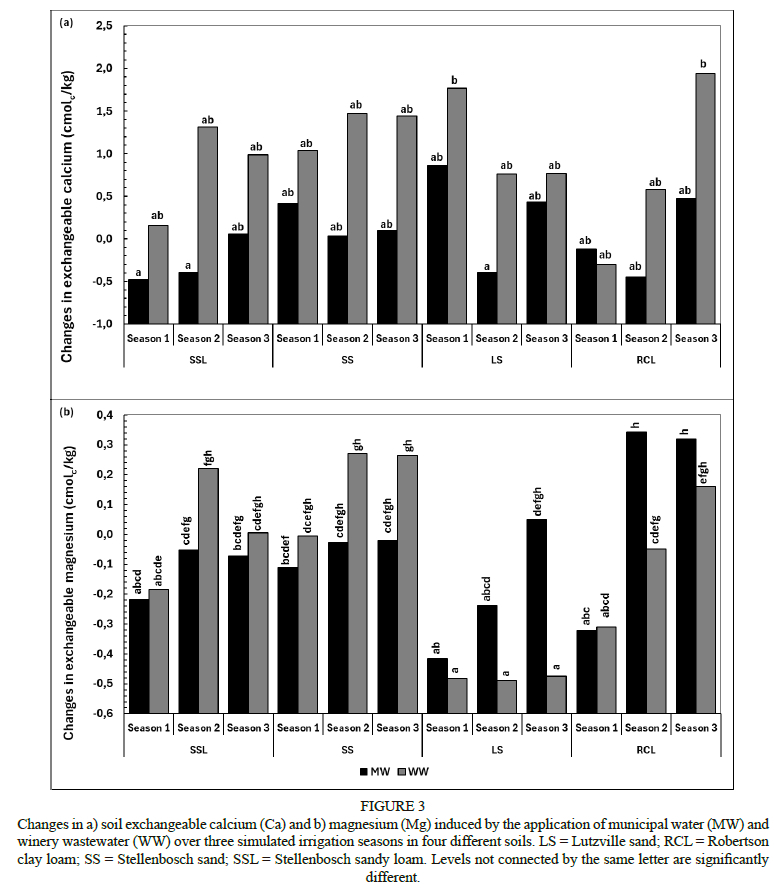 Changes in exchangeable Ca were not different between the water sources, the seasons or the soils (Fig. 3a). The lack of response could indicate that the changes in exchangeable Ca were not influenced by initial soil properties, such as texture, soil pH, exchangeable Ca or CEC, and that Ca did not accumulate with repeated application. The lack of accumulation of Ca could be attributed to the formation of Ca hydroxides and carbonates at the elevated soil pH measured in this study (Laurenson et al., 2012). These results are worrisome because Ca as a divalent cation has high flocculating capacity which could improve soil structure and water infiltration (Rengasamy & Marchuk, 2011). Similar results notably have been reported by Mulidzi et al. (2015) despite using acidic WW in a pot study, and this was attributed to the formation of Ca carbonates with increasing soil pH.