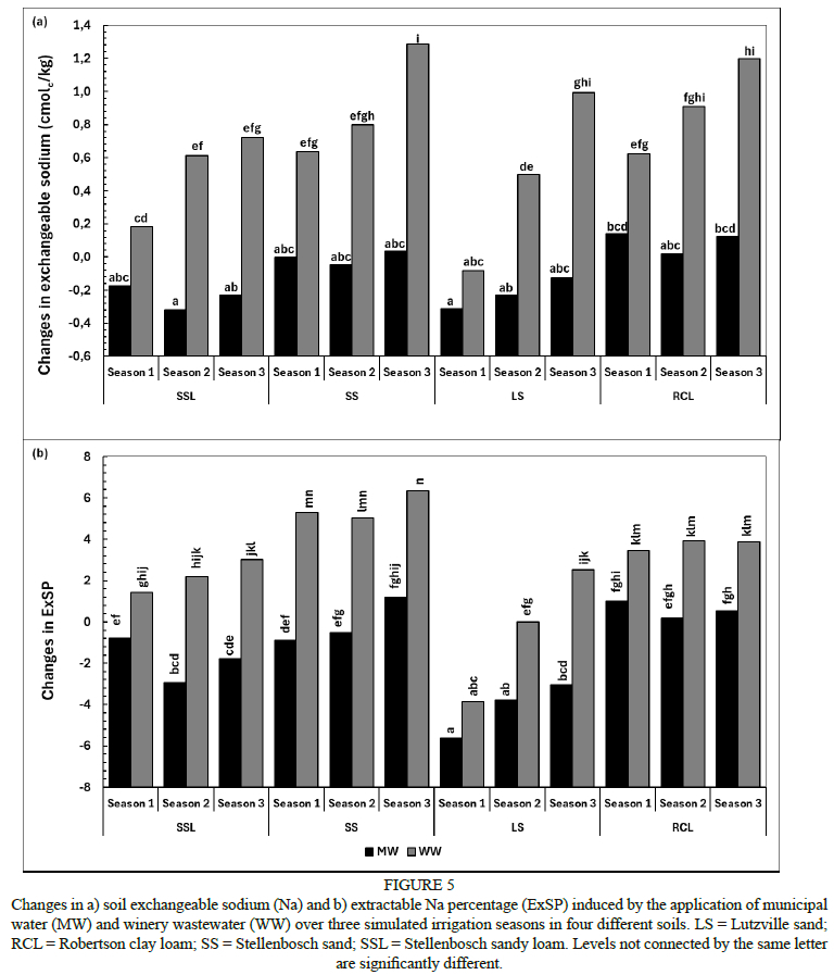 Changes in exchangeable Na induced by the application of MW were not different across seasons and soils (Fig. 5a). Changes in exchangeable Na and ExSP induced by the application of WW were larger than those induced by MW across all seasons and soils (Fig. 5a and 5b). Changes in exchangeable Na induced by the application of ranged between -0.14 and 1.56 cmolc/kg compared to -0.36 and 0.27 cmolc/kg induced by MW. Changes in exchangeable Na induced by the application of WW increased from season 1 through to season 3 for all soils. Similar to K, the larger changes in exchangeable Na were likely caused by high Na in the WW and the lack of precipitation of Na, with anions dominant at high pH. In a previous study of a pot trial with four soils of varying texture and in which WW diluted to 3 000 mg/L COD was used for irrigation, Mulidzi et al. (2015) reported a linear relationship between exchangeable Na and the cumulative applied Na through the diluted WW. Changes in exchangeable Na and ExSP induced by the application of WW were larger in RCL and lower in LS and SSL. The results reflect the adsorption of Na on exchange sites by soils with a high clay content. Similar results were reported by Mulidzi et al. (2015), who found the ratio of extractable to applied Na to increase with increasing clay content. These results are concerning, because high exchangeable Na is known to cause sodic soils, which disperse clay particles and result in the deterioration of soil structure. The high pH measured in the current study is conducive to the development of sodic soils (Qadir et al., 2007). Nonetheless, exchangeable Na did not reach detrimental levels by the termination of the study, and the highest ExSP values in WW-irrigated LS, RCL, SS and SSL were 11.3, 6.6, 10.7 and 8.6, respectively. These values are all below the critical threshold of 15% (Laker, 2004; Qadir et al, 2007; Seilsepour et al, 2009).