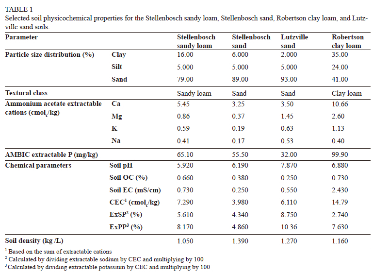 Soil samples were collected from the top 0 cm to 30 cm soil layer at each site and placed in plastic bags for transport and storage. Each composite sample consisted of seven sampling points for each soil. The soils were sieved using a 6 mm mesh sieve to remove large fragments of OM and stone fractions. The soils were put in pots with a diameter of 15.2 cm and a height of 20 cm after they had been sieved. The pot experiment was carried out under a fiberglass rain shelter at ARC Infruitec-Nietvoorbij. The soils were also sent to a commercial laboratory for determination of the initial basic physicochemical properties (Table 1).