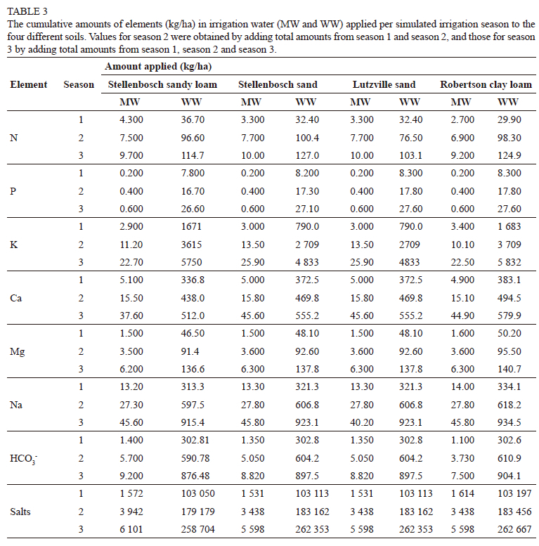 The study was conducted as a pot study at ARC Infruitec-Nietvoorbij with an experimental design of 4 x 2 x 3 factorial experiment fitted in a randomised complete block design (RCBD). The first factor was soil, where four soils that differed in their physicochemical parameters were used. The second factor was the irrigation water source, where two water sources were used. The third factor was the simulated irrigation season, which had three levels, namely season 1, season 2 and season 3. A season consisted of six irrigations. This resulted in 24 treatments that were replicated four times, and each treatment was randomly assigned within each replicate. Three pots were fitted within each treatment for destructive soil sampling after each irrigation season.