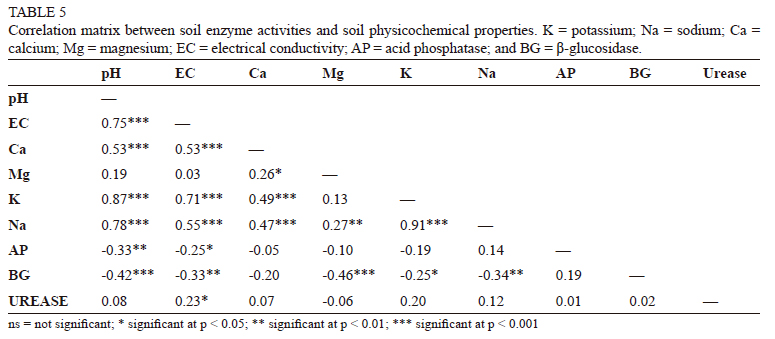 The activities of acid phosphatase, β-glucosidase and urease enzymes decreased from the initial values, as observed by negative values for changes in their activities (Fig. 6). This may be associated with the equilibration of the enzymes after the soils were collected, dried and prepared for the pot experiment (Mulidzi & Wooldridge, 2016; Rao et al., 2003). In this instance, the more negative the value of changes in enzyme activity, the larger the deviation from the initial values.