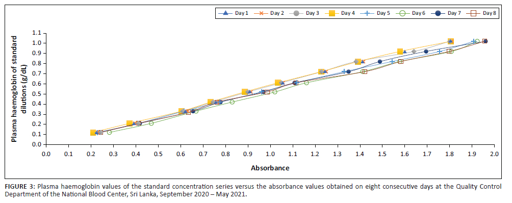 The absorbance values of the standard concentrations obtained on eight consecutive days were plotted against the plasma haemoglobin values of the standard concentration series (Figure 3). Also, a linear relationship between the mean plasma haemoglobin values and the mean absorbance values of the standard concentration series obtained on eight consecutive days was plotted to prepare the SCG (Figure 4). The resulting linear equation was used to determine the plasma haemoglobin values of RCC packs with unknown plasma haemoglobin concentrations: