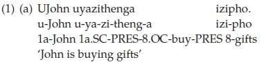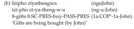 As shown in (1) above, isiXhosa allows for long passives through the use of a copular noun phrase (here, nguJohn) introduced by a copular prefix which serves the same semantic function as the English preposition by and the Afrikaans preposition deur in the context of passive sentences. The form of this prefix (here, ng-) is determined by the class of the noun to which it attaches (Louw & Jubase, 1963, p. 106). Although the isiXhosa copular noun phrase, like the English by-phrase, may occur only postverbally, its exact postverbal position may change in line with discourse factors (Du Plessis & Visser, 1992, p. 84).