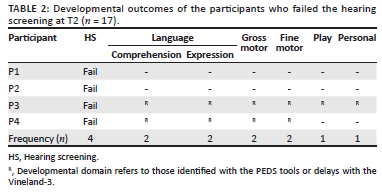 All 28 participants underwent a hearing screening, four participants (14.3%, n = 4/28) failed the hearing screening test twice, at T1 and T2, and were referred for a diagnostic hearing evaluation. The hearing screening occurred at T1 for the majority of the infants (82.14%, n = 23/28); however, some of the infants were not able to undergo the hearing screening at T1 because of external factors such as noise in the environment. The participants who were not screened at T1 were then screened at their subsequent follow-up appointment at the clinic and the results were recorded in their clinic file. Two of the four participants who failed the hearing screening presented with no developmental concerns across the PEDS tools and Vineland-3 domains (Table 2). One participant (P3, 3.57%, n = 1/17) who failed the hearing screening at T1 also presented with developmental concerns regarding language comprehension and expression, gross and fine motor skills, play and personal domains. At T2, however, no developmental concerns were identified regarding Participant Three (P3). Participant Four (P4), with identified concerns in language comprehension and expression as well as gross and fine motor skills, defaulted on the follow-up appointment (T2). It was, however, indicated in the clinic file that the caregiver needed to be contacted to book further hearing and developmental assessment for the infant.