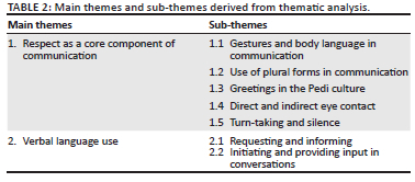 The results highlight the key themes and sub-themes derived from the study, focusing on how respect is embedded in communication within Pedi families. Respect as a core component of communication is demonstrated through various non-verbal and verbal cues, including gestures (e.g. clapping and removing headgear), eye contact (indirect eye contact as a sign of respect) and structured turn-taking (younger generations listening more than speaking). The use of plural forms when addressing elders further illustrates these respectful interactions. Verbal language use focuses on pragmatic language skills such as requesting and informing where younger individuals follow structured communication channels, often relaying information through their mothers before it reaches the head of the household, reinforcing traditional hierarchies. Overall, the findings emphasise that respect by younger generations is a fundamental principle shaping communication in the Pedi culture.