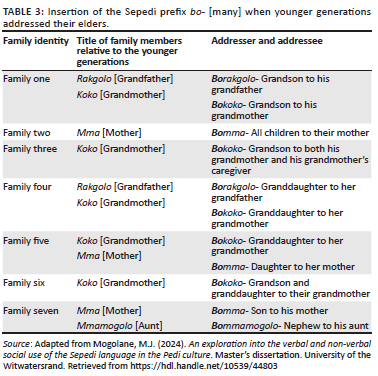 About 5.9 million South Africans are believed to be native Sepedi speakers (Census 2022b). Sepedi ranks as the fourth most commonly spoken native language in South Africa (Census, 2022b). Pedi people typically reside in the provinces of Limpopo, Mpumalanga and Gauteng, but the majority of them are inhabitants of the Limpopo province (Census, 2022b). Their family ties are strengthened as a result of their traditional values being passed down from generation to generation (Lebaka, 2019; Makgabo, 2021). Younger generations of the Pedi culture are taught cultural norms; these include, knowing how and when to speak to their different family members (Makgabo, 2021; Mphasha et al., 2021). Little is however documented about the ways in which verbal and non-verbal language is used socially by younger generations in the Pedi culture. Younger generations and younger people in this study were participants identified as daughters, sons, a nephew, grandchildren and siblings (refer to Table 1). The terms were used to describe their familial positions, not age, within their family structure.