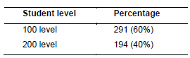 The descriptive survey was adopted for this study because descriptive research methodology is exceptionally well-suited for this investigation, which examines the origins, perceptions and strategies pertinent to the mitigation of misinformation among undergraduate students at FUL (Gliner, Morgan & Leech 2011). This methodological approach is centred on elucidating and mapping the characteristics, behaviours and attitudes present within a particular demographic or contextual framework. The population of the study consisted of 500 undergraduate students from 100-level and 200-level during the class hour in the Faculty of Sciences randomly sampled at FUL, Nigeria. However, out of the 500 questionnaires distributed, a total of 485 were duly returned representing 97% respondents.