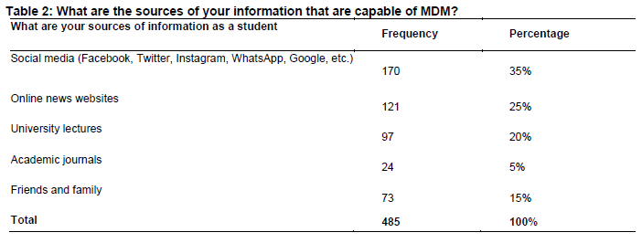 Recent studies highlight social media as a significant source of MDM among university students. Social media platforms, including Facebook, Twitter and Instagram, are prevalent due to their accessibility and user-friendly interfaces (Guess et al., 2019). These platforms, however, are often criticised for their role in spreading unverified information rapidly (Cinelli et al. 2020; Yesmin 2024). Additionally, online news websites and blogs, which may lack rigorous editorial standards, contribute to the dissemination of inaccurate information (Pennycook & Rand, 2018). University lectures and academic resources are generally considered reliable; however, occasional lapses in fact-checking and the spread of outdated information can still occur (Kata 2012). The role of family and peer networks in propagating MDM cannot be overlooked, as these sources often share information without verification, driven by trust and personal relationships (Lewandowsky et al. 2017).
