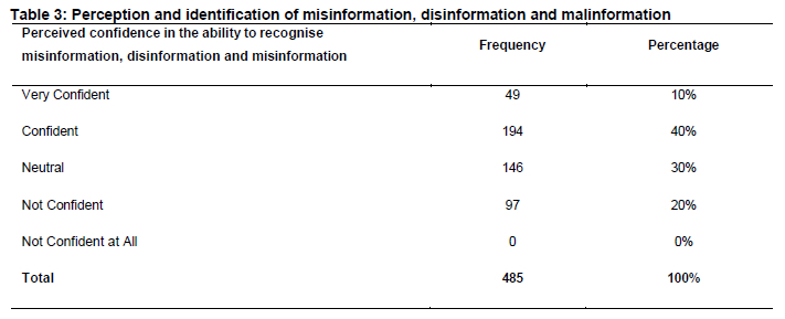 The data in Table 2 reveals diverse levels of confidence among undergraduate students at FUL in their ability to recognise misinformation, disinformation and misinformation. Most respondents (194: 40%) expressed confidence in their skills, suggesting that many students feel reasonably equipped to identify false information. This might be due to those skilled in dictating digital MDM. However, 146 respondents (30%) felt neutral, indicating a significant portion of the student body was uncertain about their ability to discern misinformation. Additionally, 97 respondents (20%) reported feeling not confident, highlighting a considerable need for improved education and resources in this area. Meanwhile, a smaller group (49 respondents: 10%) felt very confident in their ability to recognise misinformation, showcasing a minority with strong self-assurance. Notably, no respondents reported feeling not confident at all, implying that all students possessed at least a minimal level of confidence. This distribution underscores the importance of targeted interventions to enhance students' critical evaluation skills and overall confidence in navigating misinformation.