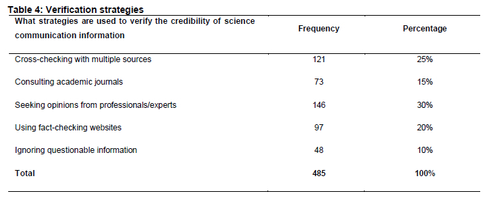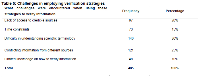 The data in Table 4 highlights the various challenges undergraduate students at FUL face when verifying scientific information. The most significant challenge, reported by 146 respondents (30%), was the difficulty in understanding scientific terminology, which suggests a need for better scientific literacy and more accessible language in scientific communication. Conflicting information from different sources is the second most common issue, affecting 121 respondents (25%), indicating the confusion that arises from contradictory data. A lack of access to credible sources is a challenge for 97 respondents (20%), reflecting potential barriers in obtaining reliable information, possibly due to limited digital infrastructure or resource availability. Time constraints, impacting 73 respondents (15%), showed that thorough verification can be time-consuming and not always feasible for students. Lastly, limited knowledge of how to verify information affected 48 respondents (10%), underscoring the gap in students' training and education regarding effective verification techniques. This finding concurs with the argument of Dame Adjin-Tettey (2022). Therefore, adjudicating for enhanced educational programmes to improve scientific literacy, critical thinking skills and access to reliable resources.