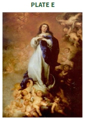 Plate D Immaculate Conception (1678), E Immaculate Conception (1655), F St Bernard and the Virgin (1655), by Murillo. In the 1655 and 1678 paintings Mary had just received the message that she was expecting the Saviour, and she conserved the message in her heart. Her face is one of wonder; she apparently stands on the moon and a cloud and is supported by baby-like angels. The angels are in amazement and adoration. St Bernard is seen in adoration of Mary in Plate G. She has baby Jesus in her left arm, and has an open breast so as to feed the baby, but is looking at the Saint. St Bernard is pointing to the Scriptures: 'so that the Scriptures may be fulfilled...' The central spaces of the paintings are illumined, but the source of light is hidden. The atmosphere is one of wonder, silence, humility, adoration and upliftment (cf. further Garin, 1995:32-34).