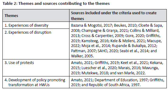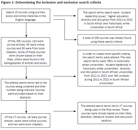 In addition, a number of keywords were used to search for sources. The abbreviation 'SRC' and the keyword 'student leadership' were used in database searches. Additional key phrases that informed the search were 'SRCs in historically white universities'; 'student leadership in historically white universities'; 'diversity and disruption in South African universities from 2011 to 2022'; and 'SRC protests from 2011 to 2022 in South African universities'.